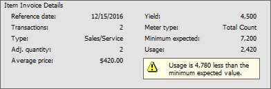 warning icon on each line where the item's actual usage is below the expected usage. If you hover over the icon, the system will display the message: "Usage is [shortage amount] less than the minimum expected value."