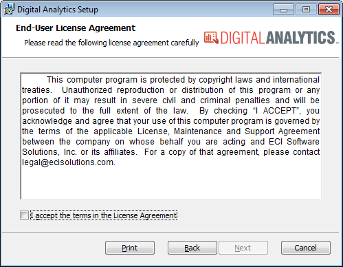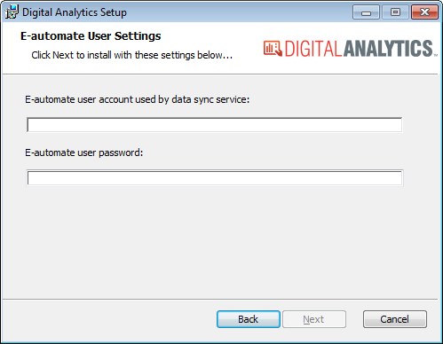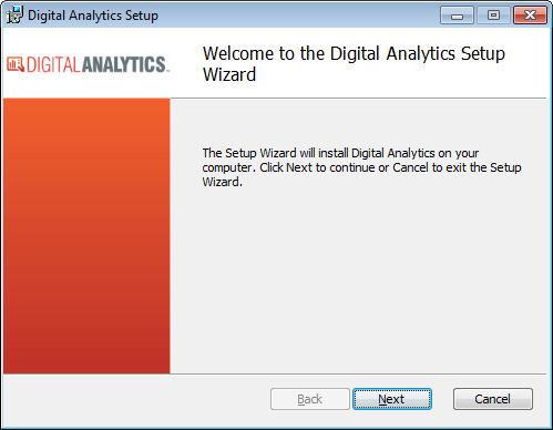 Open the Digital Analytics MSI file to access the Digital Analytics Setup window.