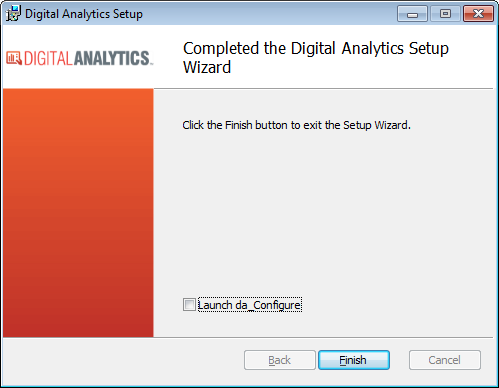 When the installation is complete, the system displays the Completed the Digital Analytics Setup Wizard window. Check the Launch da_Configure box if you want the system to open the da_Configure window after you click the [ Finish ] button.