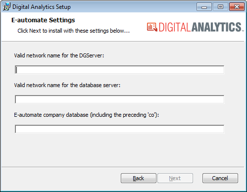In the DG Server field, enter the name of DG Server where the e-automate database resides (or make no change to use the value displayed).