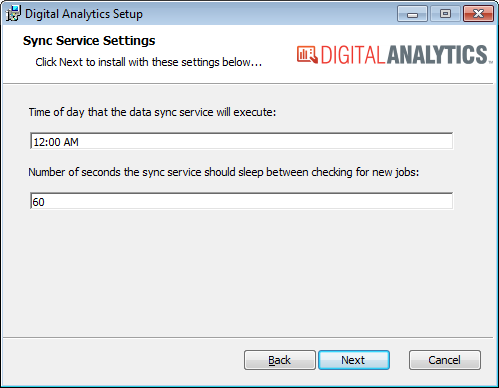 In the Number of seconds the sync service should sleep between checking for new jobs field, enter the frequency (in seconds) at which the service should check to determine if the Digital Analytics Data Process utility should be run or make no change to use the value displayed.