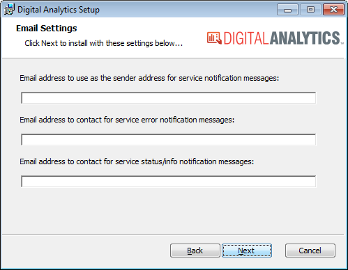 SMTP settings must be properly configured for Digital Analytics to send notification emails. During the installation process, the system collects e-mail credentials as part of the process of configuring Digital Analytics for the company database you specify. After the installation, you can use the Digital Analytics Configuration utility (da_Configure) to update this information for that company database and/or to enter information to use in conjunction with other company databases for which you configure Digital Analytics. For more information, see the Digital Analytics Configuration Utility > Editing Data Process Service Parameters section of this topic.