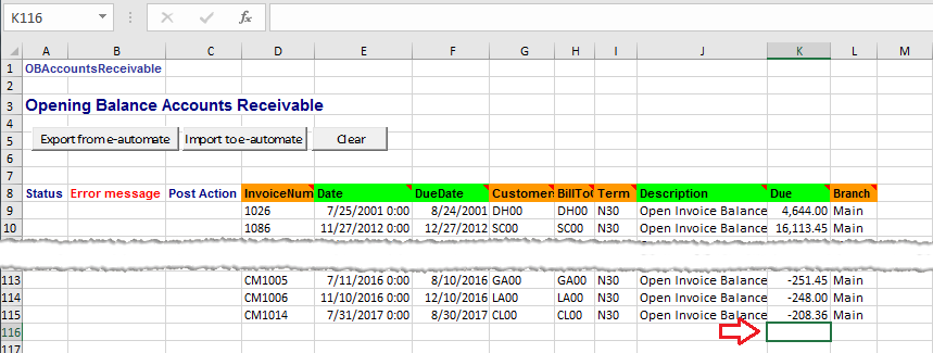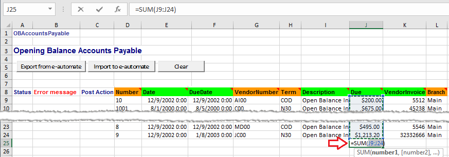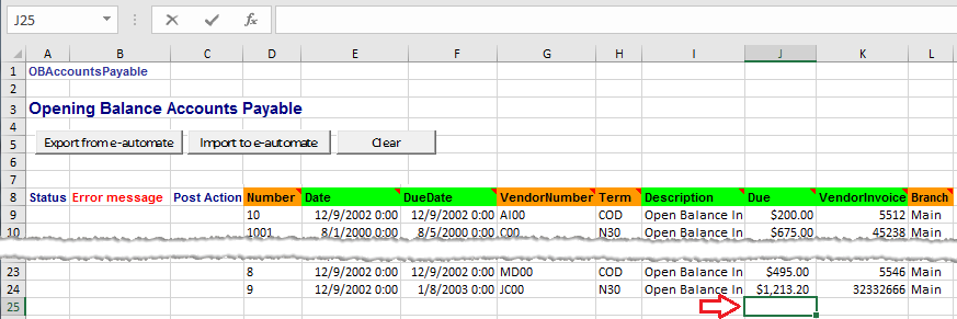 If any value other than 10, 2/10, 30 or COD is entered in the Term column, that value is rejected when you import and the spreadsheet will report an error. Other cells are validated against a specified format where you can enter only a specific value. An example is when the cells require either True or False. If you enter any value other than True or False, the import will produce an error.