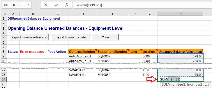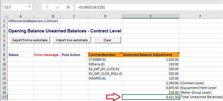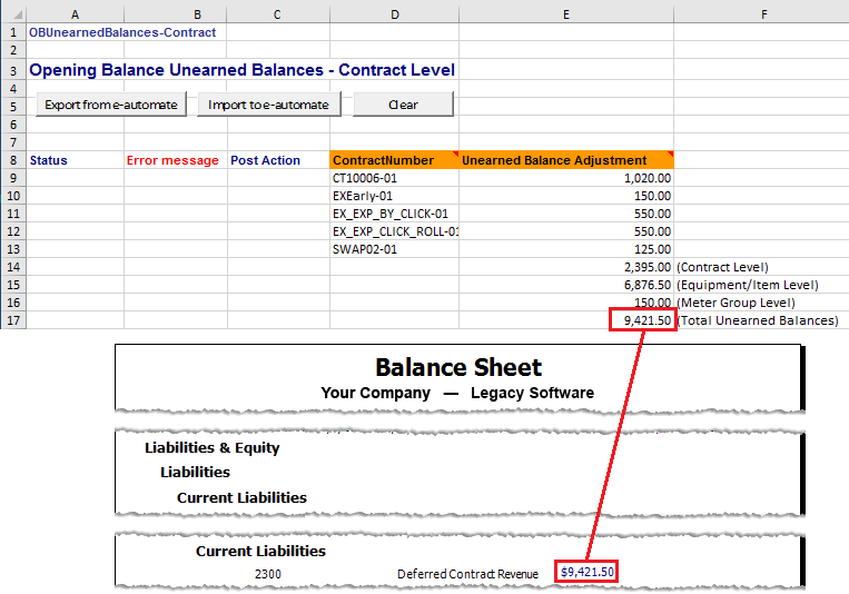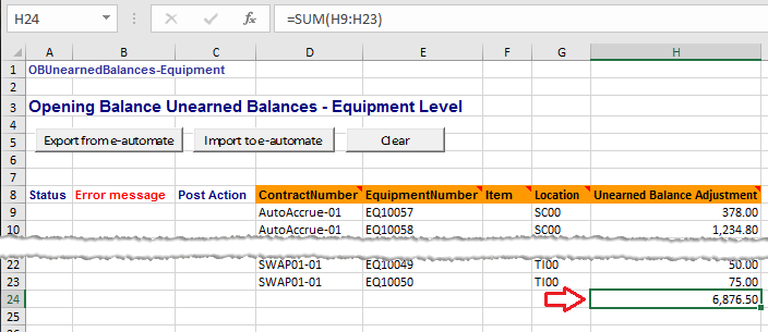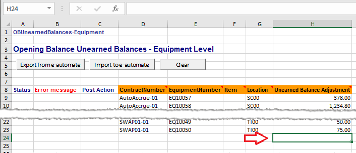 You use the Contract Detail Leases worksheet to import equipment and item sublease detail for accrual contracts that have an unearned balance at the contract level. Prior to importing this detail, you must have the following information set up in e-automate:
