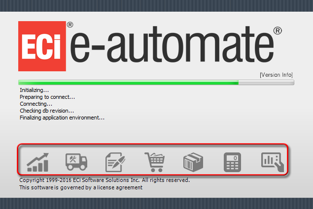 For each software product in the e-automate product portfolio, the splash screen (the screen that displays while the software is loading), the About window, and/or a similar window lists a row of icons (see sample e-automate splash screen below).