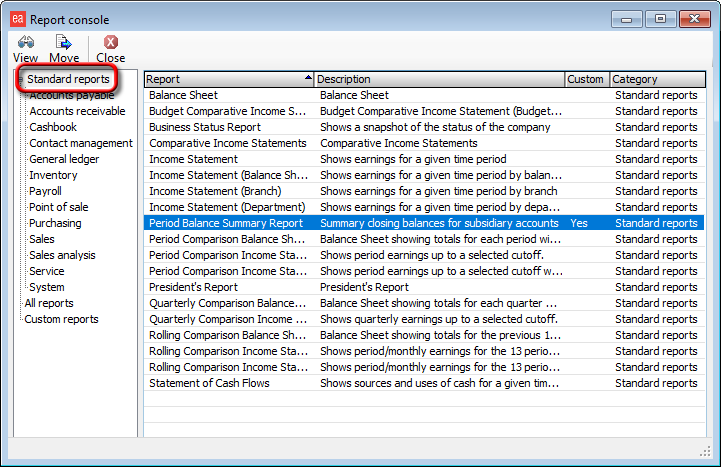 In the left pane, click Standard reports. The system displays the report list in the right pane. The Period Balance Summary Report should be listed in the right pane. If the system does not display the Period Balance Summary Report in the right pane, review the previous steps.