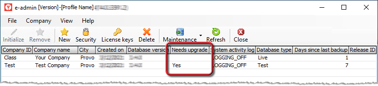 After updating your e-automate software from one version to another, you must update your database to the new version format. You use e-admin maintenance to update your database format. To assist you in determining which databases need to be updated, the system reports version information in the e-admin window's Version column for all databases and lists Yes in the Needs upgrade column for each database that needs to be upgraded.